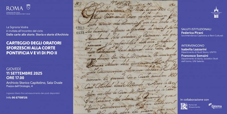 Nell’ambito del ciclo di iniziative Dalle carte alle storie: Storia e storie d’Archivio, il giorno 11 settembre 2025 presso la Sala Ovale dell’Archivio Storico Capitolino avverrà l’incontro: