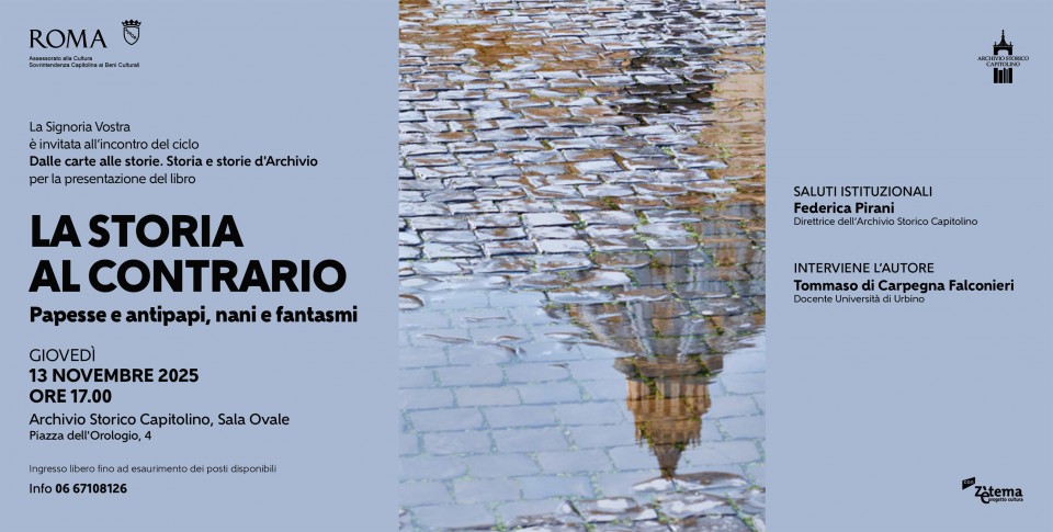 Nell’ambito del ciclo di iniziative Dalle carte alle storie: Storia e storie d’Archivio, il giorno 13 novembre 2025 presso la Sala Ovale dell’Archivio Storico Capitolino avverrà l’incontro: