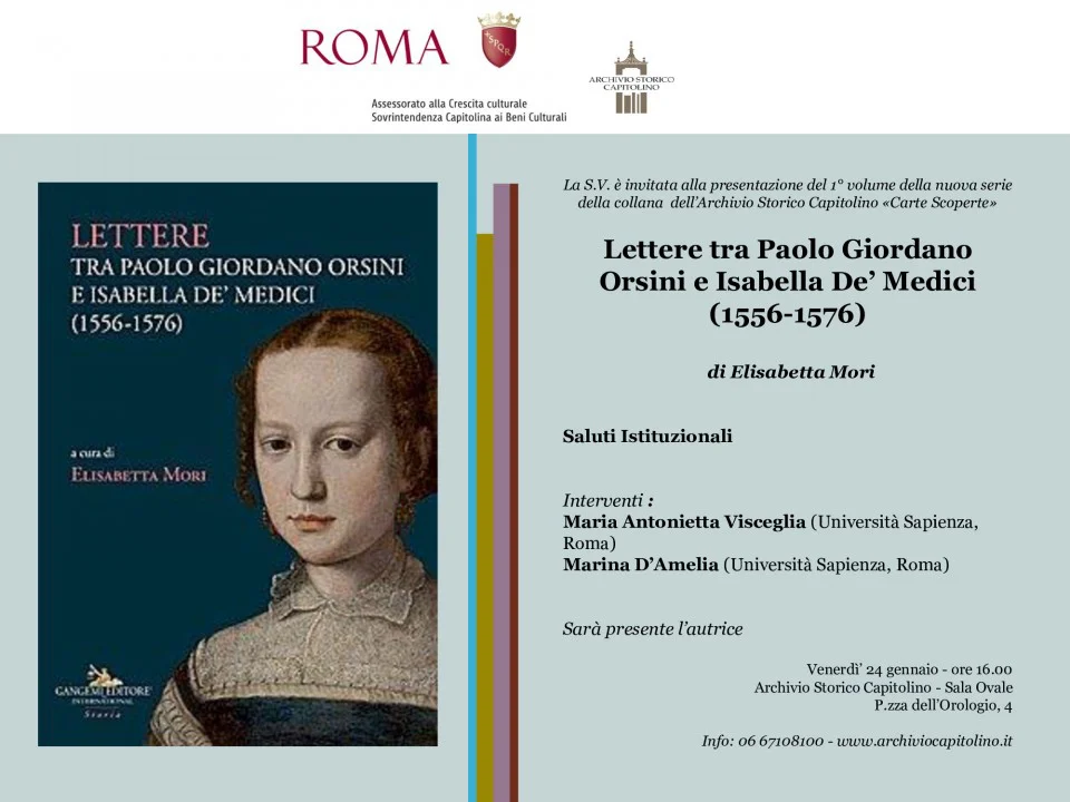 L’Archivio Storico Capitolino conserva tra i suoi fondi più importanti quello della famiglia Orsini (XII-XIX sec.). Durante il lavoro di riordinamento sono emerse più di cinquecento lettere scambiate tra Paolo Giordano Orsini I duca di Bracciano (1541-1585) e sua moglie Isabella de’ Medici (1542-1576) figlia del Granduca di Toscana Cosimo I. Sono state anche rinvenute lettere spedite a Isabella dai fratelli, Lucrezia duchessa di Ferrara, Ferdinando cardinale, Francesco Granduca, oltre che da uomini e donne tra i più potenti del tempo, Caterina de Medici ed Elisabetta d’Asburgo regine di Francia, Enrico III, Don Giovanni d’Austria, Caterina regina di Polonia, Margherita di Savoia e perfino da gente comune che le chiede protezione. Si tratta di una fonte molto importante non solo perché dimostra la funzione politica di entrambi i duchi di Bracciano nella Firenze e nella Roma del tardo Rinascimento, ma anche la complice intesa che li lega sin da bambini e la profonda attenzione che seppero dedicare agli affetti familiari. Queste lettere sono ancora quasi del tutto inedite, anche se l’autrice ne ha già utilizzato il contenuto per ricostruire le vicende dei due sposi che una lunga tradizione storiografica di matrice antimedicea aveva rivestito di tradimenti e delitti.