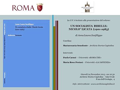 Martedì 24 novembre alle ore 16:30 presso la Sala Ovale dell’Archivio Storico Capitolino, p.zza dell’Orologio 4, si terrà la presentazione del volume: Un Socialista ribelle: Nicolò Licata (1901-1983) di Anna Laura Sanfilippo.