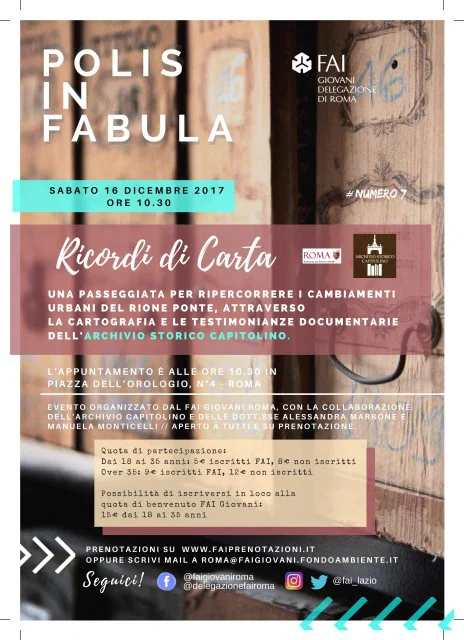 Il giorno 16 dicembre alle ore 10.30 l’Archivio Storico Capitolino ospiterà il 7° appuntamento di “Polis in Fabula”, il ciclo di passeggiate urbane in itinerari insoliti, organizzate dal FAI Giovani Roma, per comprendere nel più profondo i cambiamenti della Città attraverso i secoli.